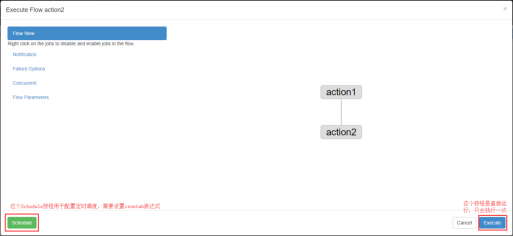 | 左侧绿色的Schedule用来配置定时调度,使用crontab表达式的方式实现。右侧蓝色的Execute按钮是直接运行,但只会运行一次。出于简单测试目的,我们点击Execute即可 |