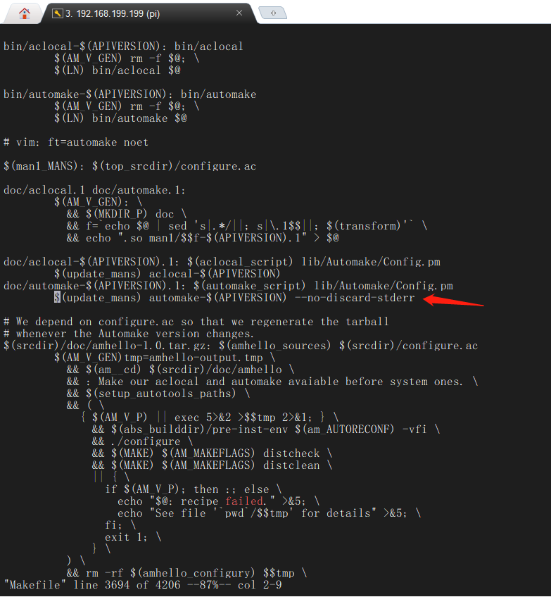 解压后,需要修改automake的Makefile,按下面的箭头所示增加 --no-discard-stderr参数