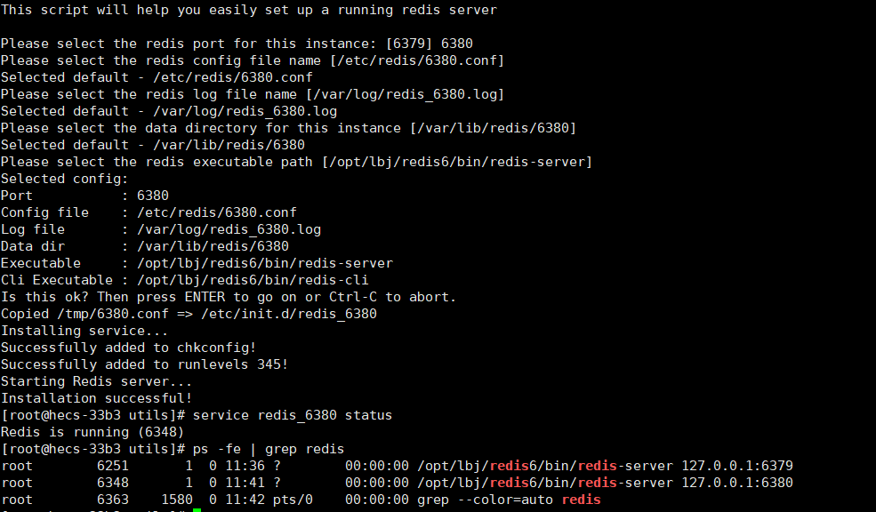 再通过脚本设置另外一个6380端口的redis实例,通过ps -fe | grep redis查看已经启动redis进程,此时就可以看到6379和6380两个redis实例已经启动了。