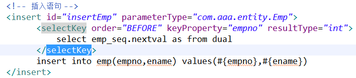 ③ order: 这可以被设置为 BEFORE 或 AFTER。如果设置为 BEFORE,那么它会首先选择主键,设置 keyProperty 然后执行插入语句。如果设置为 AFTER,那么先执行插入语句,然后是 selectKey 元素-这和如 Oracle 数据库相似,可以在插入语句中嵌入序列调用。