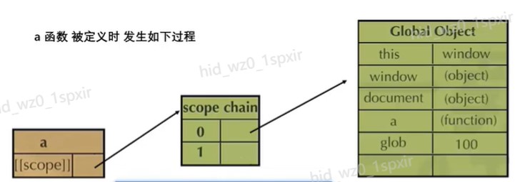 - 在JavaScript中,函数也是对象,实际上,JavaScript里一切都是对象。函数对象和其他对象一样,拥有可以通过代码访问的属性和一系列仅供JavaScript引擎访问的内部属性。其中一个内部属性是[[Scope]],该内部属性包含了函数被创建的作用域中对象的集合,这个集合被称为函数的作用域链,它决定了哪些数据能被函数访问。