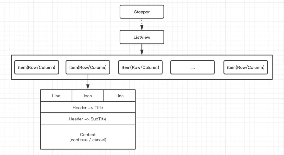 分析源码,Stepper 横向方式是将 Step 放置在 Row 中,此时若 Step 数量过多会造成宽度溢出;小菜调整存储方式,将自定义的 ACEStepper 放置在横向 ListView 中,不会限制宽度,放置多个 ACEStep 可横向滑动;