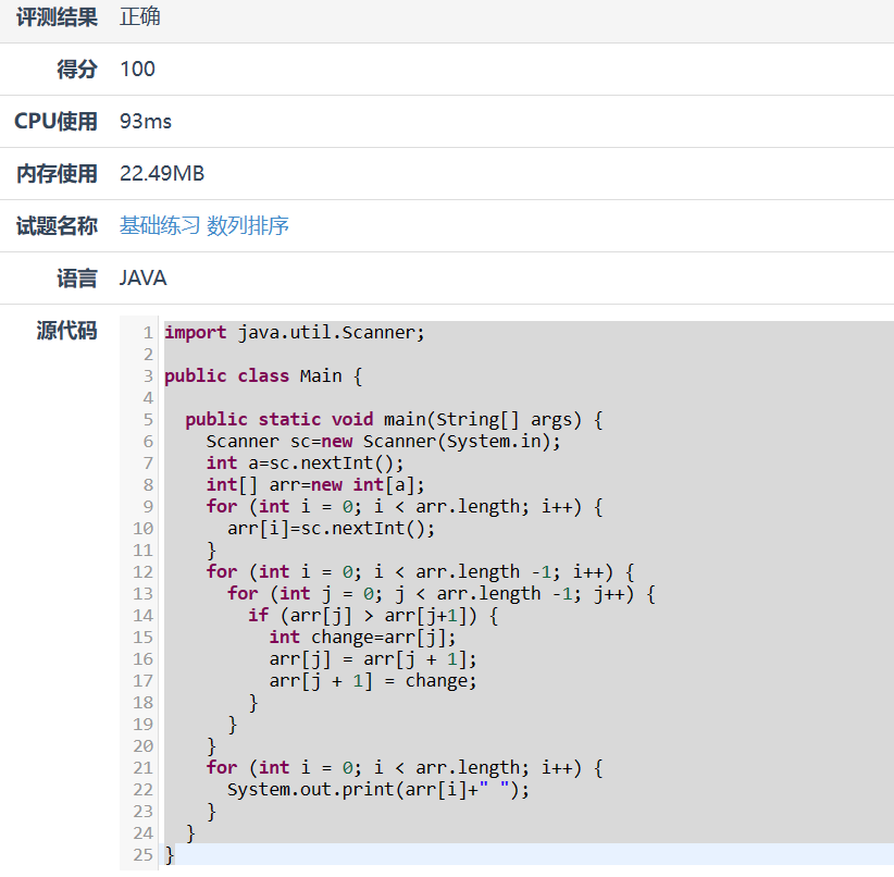 【摘要】 资源限制时间限制:1.0s 内存限制:512.0MB问题描述 给定一个长度为n的数列,将这个数列按从小到大的顺序排列。1<=n<=200输入格式 第一行为一个整数n。 第二行包含n个整数,为待排序的数,每个整数的绝对值小于10000。输出格式 输出一行,按从小到大的顺序输出排序后的数列。样例输入58 3 6 4 9样例输出3 4 6 8 9提交代码编译语言:Java代码:impo...