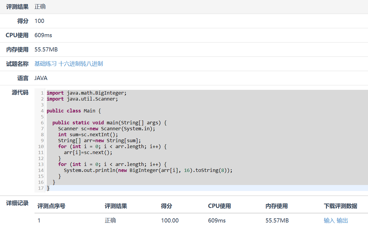 【摘要】 资源限制时间限制:1.0s 内存限制:512.0MB问题描述 给定n个十六进制正整数,输出它们对应的八进制数。输入格式 输入的第一行为一个正整数n (1<=n<=10)。 接下来n行,每行一个由0~9、大写字母A~F组成的字符串,表示要转换的十六进制正整数,每个十六进制数长度不超过100000。输出格式 输出n行,每行为输入对应的八进制正整数。 【注意】 输入的十六进制数不会...