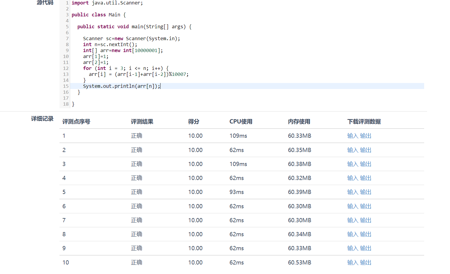 【摘要】 问题描述Fibonacci数列的递推公式为:Fn=Fn-1+Fn-2,其中F1=F2=1。当n比较大时,Fn也非常大,现在我们想知道,Fn除以10007的余数是多少。输入格式输入包含一个整数n。输出格式输出一行,包含一个整数,表示Fn除以10007的余数。说明:在本题中,答案是要求Fn除以10007的余数,因此我们只要能算出这个余数即可,而不需要先计算出Fn的准确值,再将计算的结果除以100...