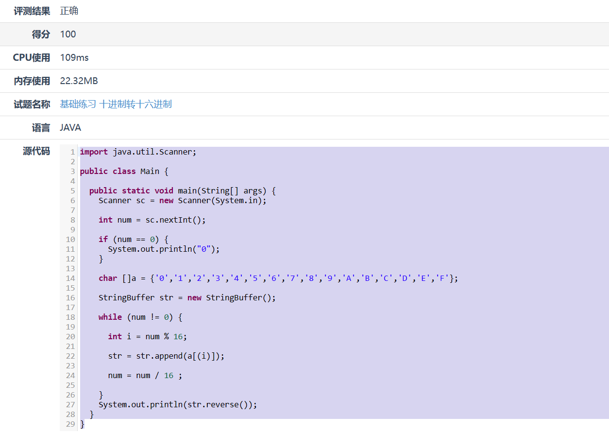 【摘要】 资源限制时间限制:1.0s 内存限制:512.0MB问题描述 十六进制数是在程序设计时经常要使用到的一种整数的表示方式。它有0,1,2,3,4,5,6,7,8,9,A,B,C,D,E,F共16个符号,分别表示十进制数的0至15。十六进制的计数方法是满16进1,所以十进制数16在十六进制中是10,而十进制的17在十六进制中是11,以此类推,十进制的30在十六进制中是1E。 给出一个非负...