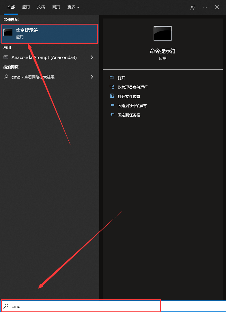 2、或者win + S 搜索输入 cmd