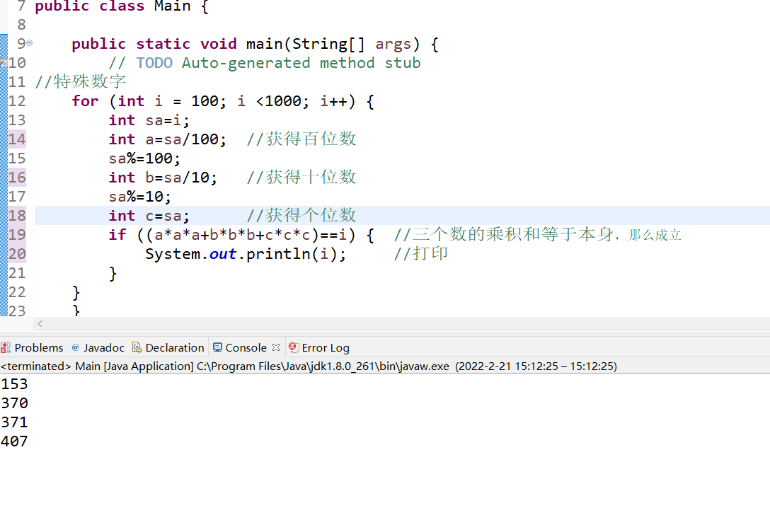 if ((a*a*a+b*b*b+c*c*c)==i) { //三个数的乘积和等于本身,那么成立