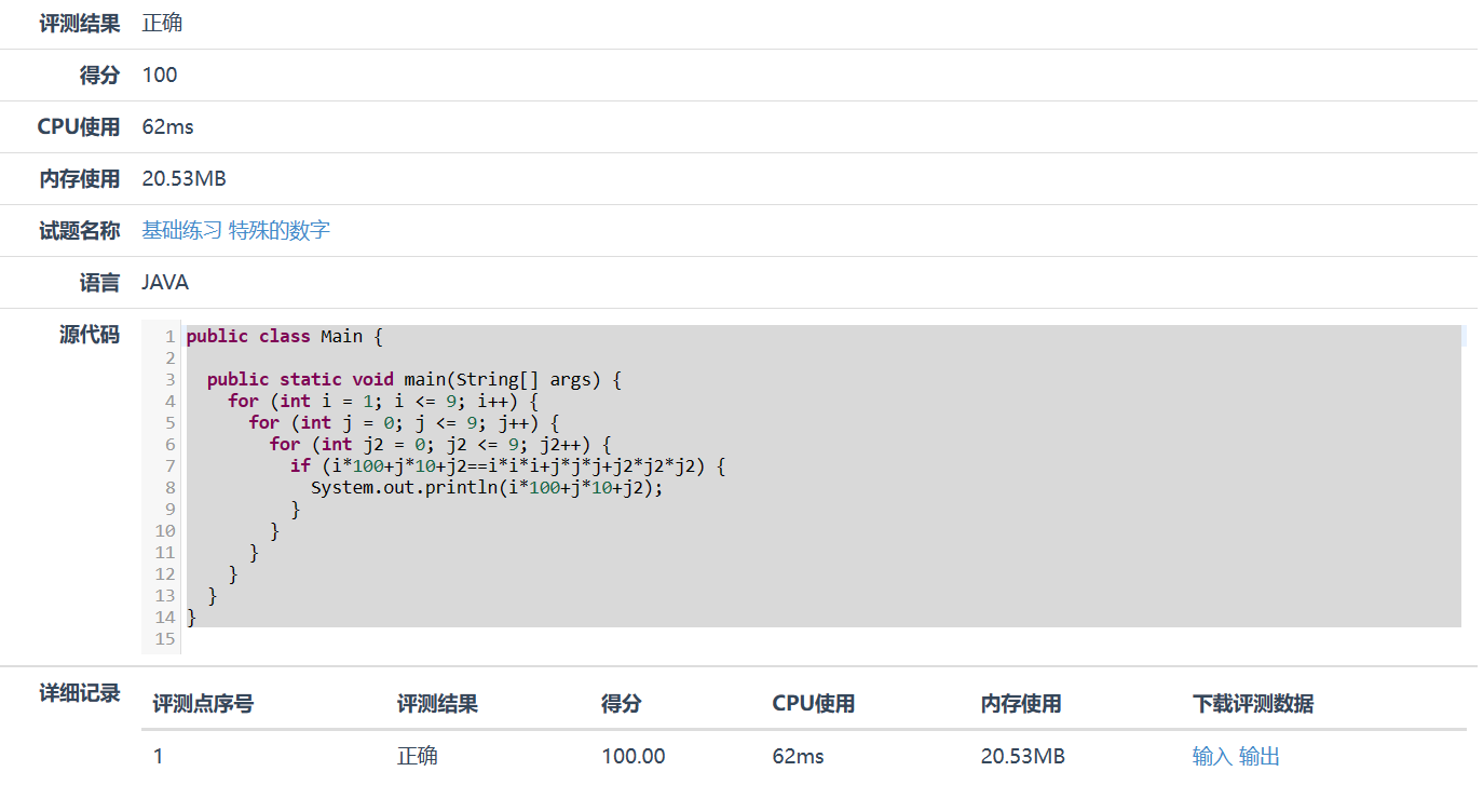 【摘要】 资源限制时间限制:1.0s 内存限制:512.0MB问题描述 153是一个非常特殊的数,它等于它的每位数字的立方和,即153=1*1*1+5*5*5+3*3*3。编程求所有满足这种条件的三位十进制数。输出格式 按从小到大的顺序输出满足条件的三位十进制数,每个数占一行。提交代码编译语言:Java代码:public class Main { public static void m...