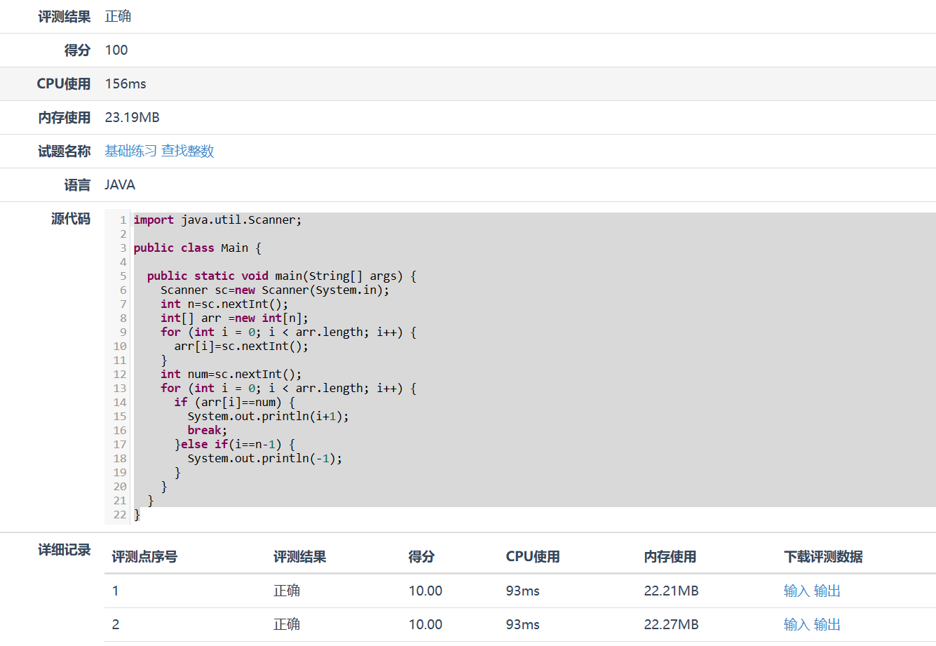 【摘要】 资源限制时间限制:1.0s 内存限制:256.0MB问题描述给出一个包含n个整数的数列,问整数a在数列中的第一次出现是第几个。输入格式第一行包含一个整数n。第二行包含n个非负整数,为给定的数列,数列中的每个数都不大于10000。第三行包含一个整数a,为待查找的数。输出格式如果a在数列中出现了,输出它第一次出现的位置(位置从1开始编号),否则输出-1。样例输入61 9 4 8 3 99样例...