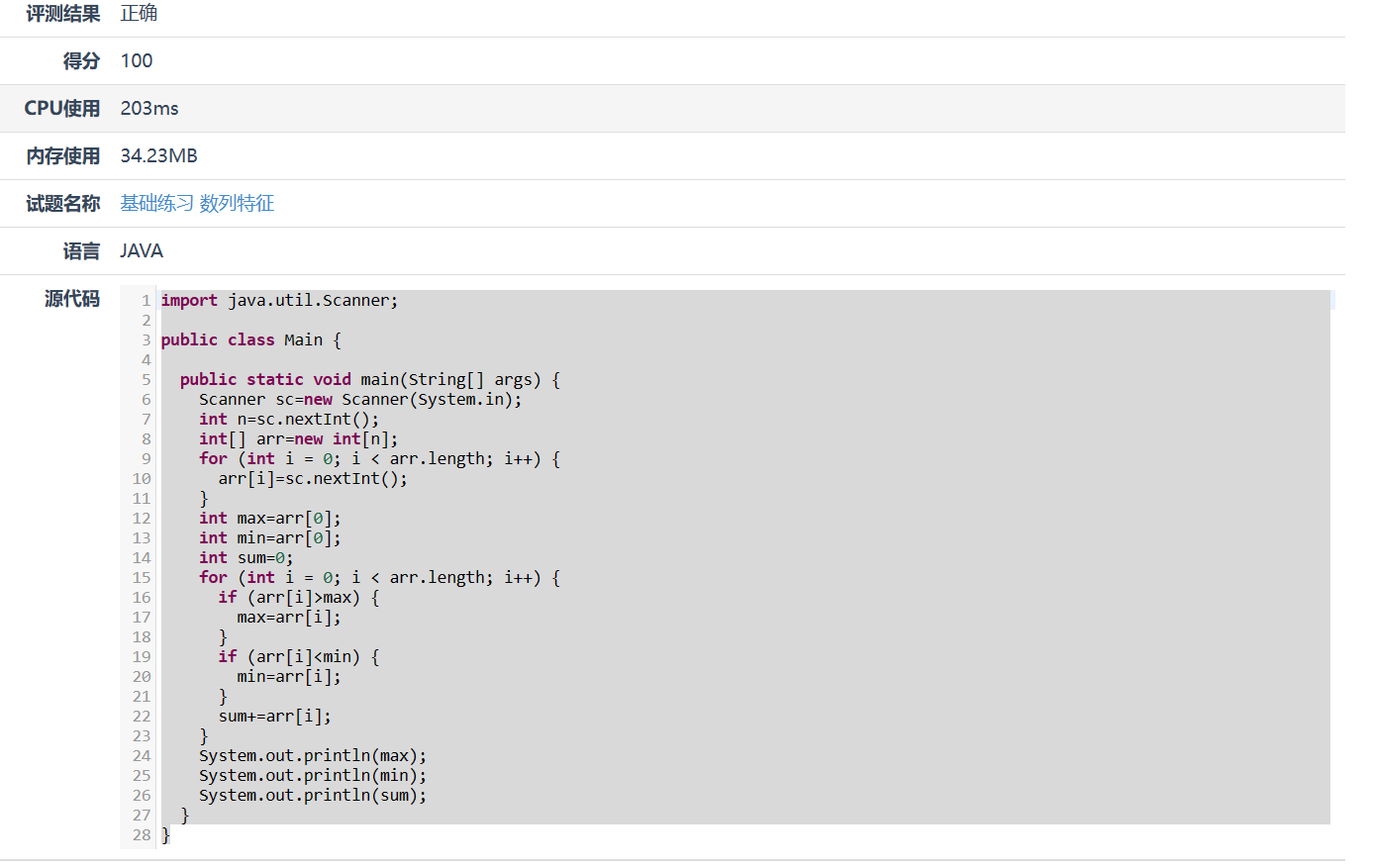【摘要】 资源限制时间限制:1.0s 内存限制:256.0MB问题描述给出n个数,找出这n个数的最大值,最小值,和。输入格式第一行为整数n,表示数的个数。第二行有n个数,为给定的n个数,每个数的绝对值都小于10000。输出格式输出三行,每行一个整数。第一行表示这些数中的最大值,第二行表示这些数中的最小值,第三行表示这些数的和。样例输入51 3 -2 4 5样例输出5-211数据规模与约定1 <= ...