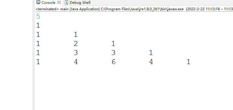 // 第n+1行的第i个数字等于第n行的i-1个数字加上第n行的i个数字。