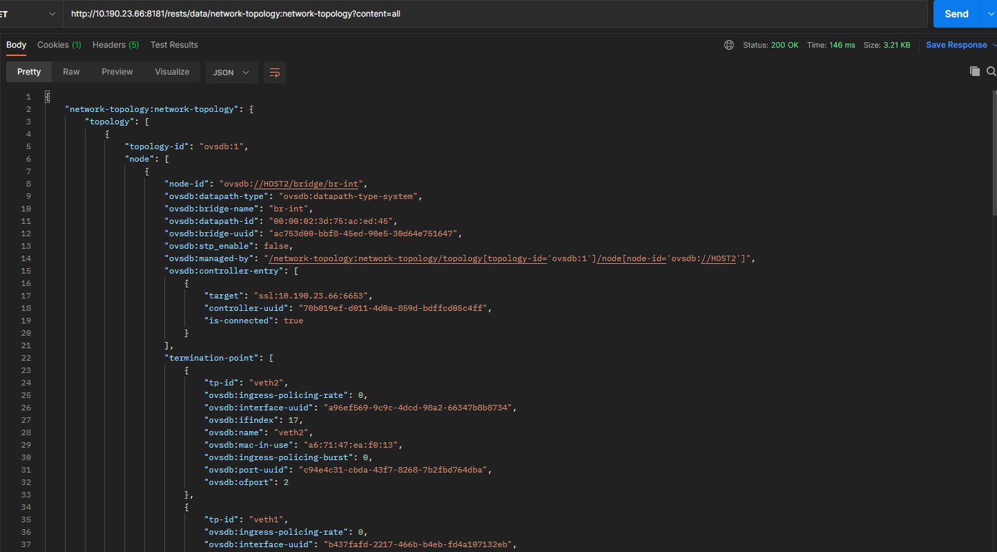 最后进行使用postman,调用(put)http://控制器IP:8181/rests/data/network-topology:network-topology/topology=ovsdb%3A1,将需要连接的OVS设备信息remote-ip,remote-port导入控制器,即可实现控制器OVSDB协议主动连接ovs设备。