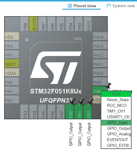 在Pinout view视图中,找到PA8引脚,左键点击后,在出现的菜单上选择GPIO_Input.因为系统要接收到外部信号,这里就是Input了。