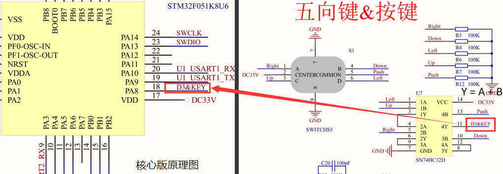 用一个5向按键通过一个信号输出引脚接到了PA8.