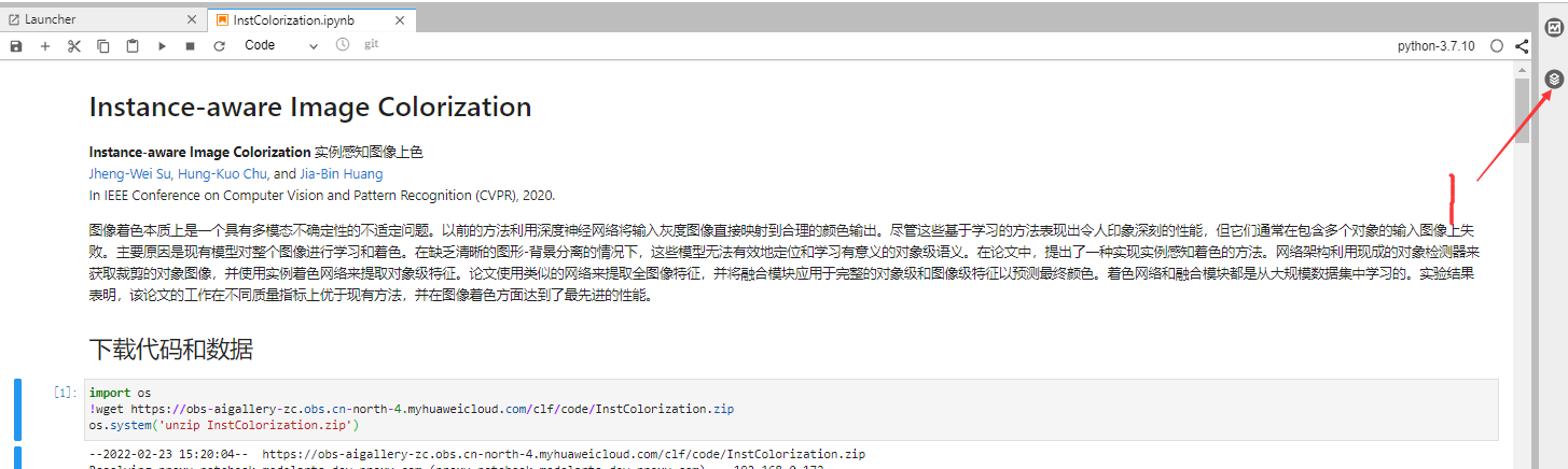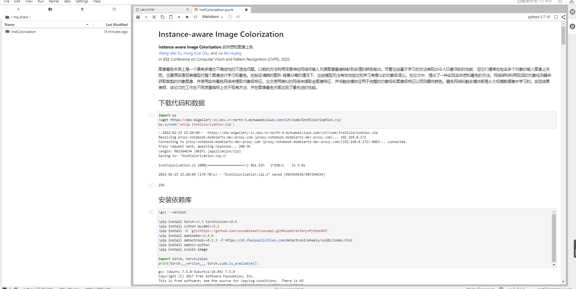 点击下方连接进入 实例感知图像上色 的 JupyterLab 页面,进入代码操作界面