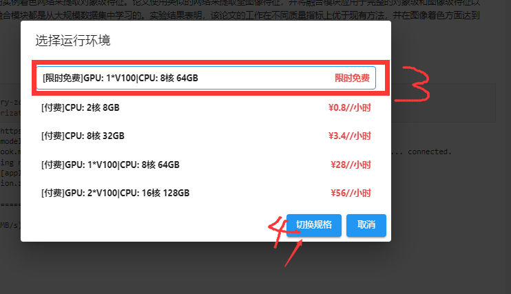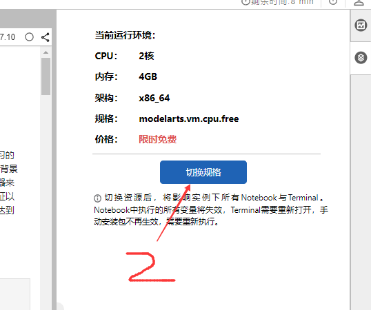不要使用默认的配置信息,这里我们选择GPU: 1*V100|CPU: 8核 64GB的环境,默认的信息在配置 Detectron2时,会报错。