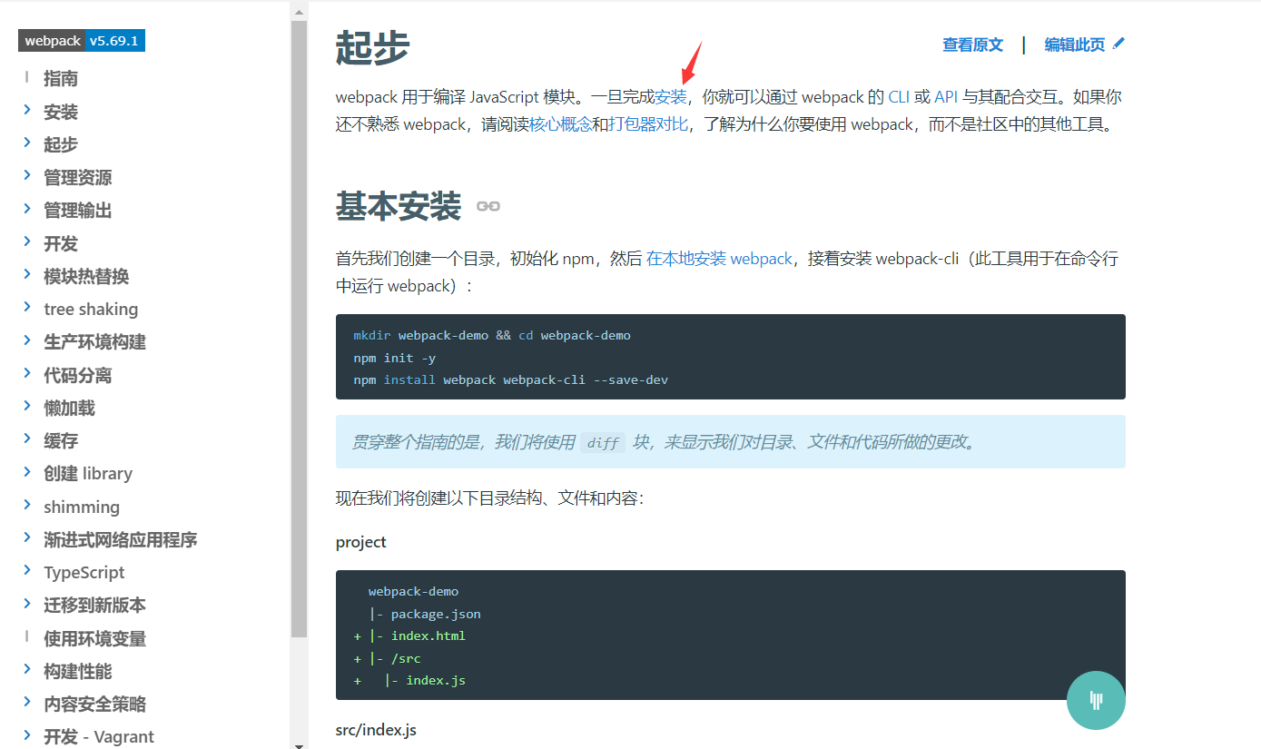 这份官方文档还是比较好用的,从webpack的基础概念到入口起点再到输出等都有详细地介绍。其中的蓝色字体都是超链接,可以跳转到其他的教程中,比如箭头所指的“安装”,点击就可以跳转到webpack的安装教程中。