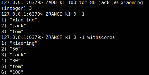 通过zrange key 开始索引位 结束索引位 withscores的指令进行查看,如果不加withscores参数则只会显示所有的元素,加上则会将分值和元素都显示出来