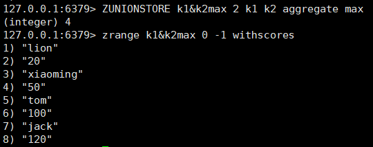 下图为取最大的指令是zunionstore 任意设定的变量 需要计算几个集合 集合1 集合2 aggregate max,取两个集合中各个元素最大的分值