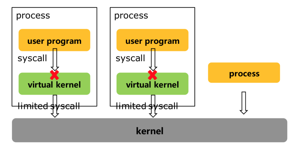 1)虚拟内核,设置进程的4种模式,HR0、HR3、GR0、GR3,通过拦截系统调用,实现了一个虚拟内核,用户进程与host kernel不直接交互。