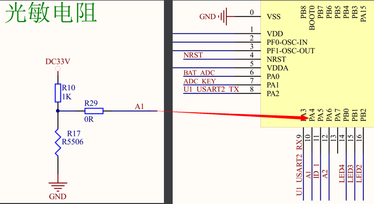 根据电路板接线图PA4引脚作为ADC读数据信号引脚。