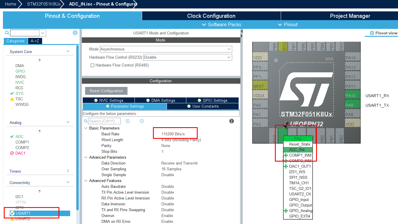 重点是在PA4引脚点击鼠标左键,选择ADC_IN4.