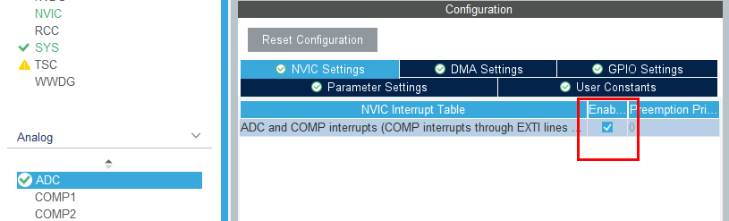 选中ADC配置,NVIC让中断使能。当ADC转换成功后输出一个中断。