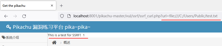 利用file协议可以访问Web本地文件。如下图所示,在url后面拼接本地服务器文件地址(提前在C:\Users\Public下创建一个文件test.txt,写入内容“This is a test for SSRF!”),即可读取本地文件内容。