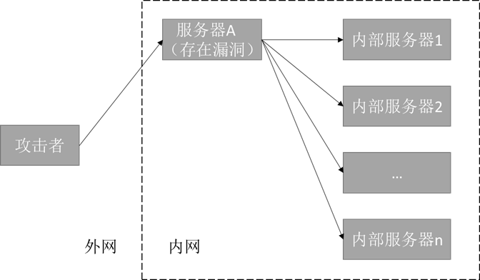 如下图所示,服务器A存在SSRF漏洞可被攻击者访问,内网中的其他服务器不能被攻击者直接访问,攻击者就可以向服务器A发送请求,服务器A再向内部服务器发送请求,内部服务器返回数据给服务器A,服务器A再将内部服务器的响应数据返回给攻击者,服务器A作为中间人被攻击者利用,从而达到攻击者的目的。