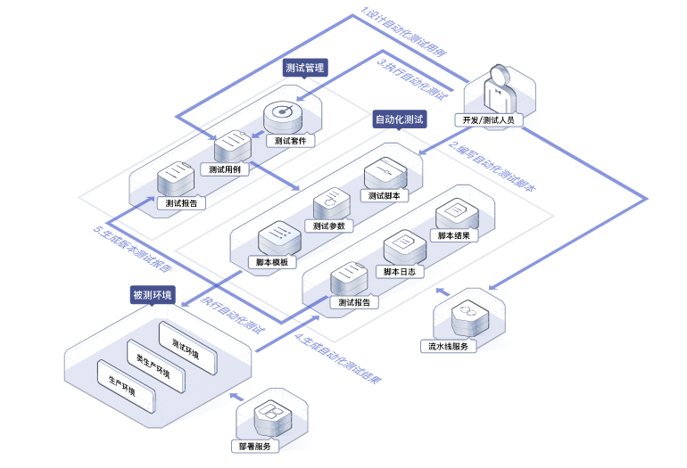 在持续自动化测试场景,支持DevOps模式,代码提交自动触发流水线执行自动化测试,并及时反馈代码测试质量问题,提升产品版本发布的质量和效率;接口测试原生支持Swagger接口描述、HTTP/HTTPS、REST风格接口,支持前后端分离和微服务架构的分层自动化测试;同时持续集成自动化测试管理,并自动生成测试报告(包含测试覆盖率、测试通过率等)。
