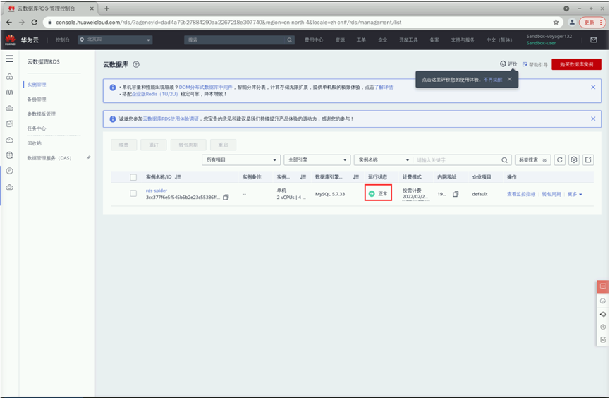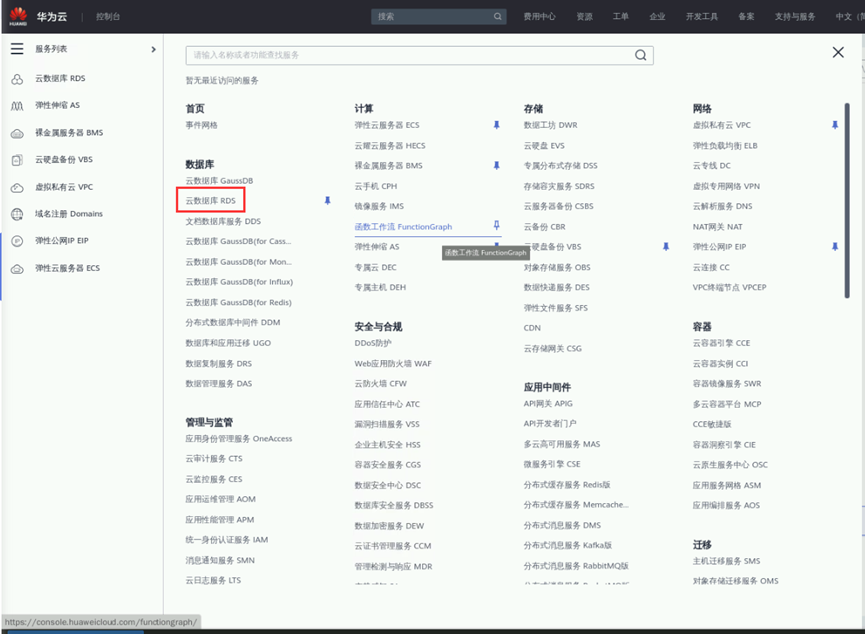 在已登录的华为云控制台,展开左侧菜单栏,点击“服务列表”->“数据库”->“云数据库 RDS”进入云数据库RDS控制台。
