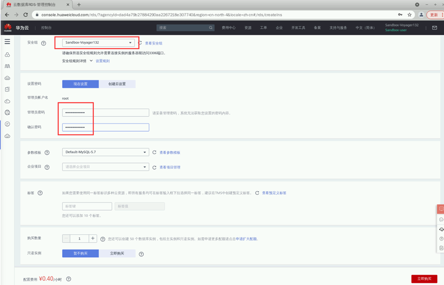 ⑤ 内网安全组:选择预置环境预置的内网安全组;
