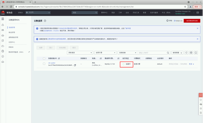 参数设置完成点击“立即购买”,确认参数无误后点击“提交”完成购买,点击“返回云数据库RDS列表”可查看到云数据库RDS正在创建中,约等待【4-6分钟】数据库状态变为“正常”,说明数据库创建完成,如下图所示: