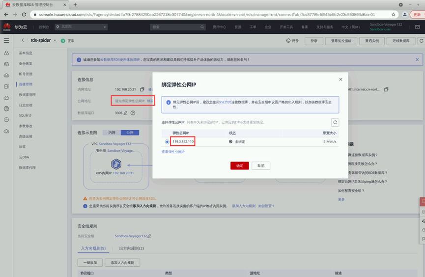 点击云数据库RDS“rds-spider”进入详情页,在左侧导航栏,单击“连接管理”->“公网地址”->单击“绑定”->“确定”。如下图所示: