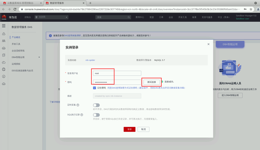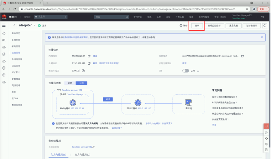 弹性公网IP绑定完成,点击“登录”,输入用户名:root,密码:创建云数据库RDS时设置的密码,如下图所示。在此步骤中可以测试下密码是否正确。