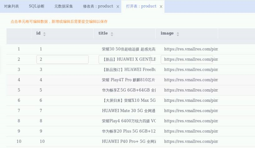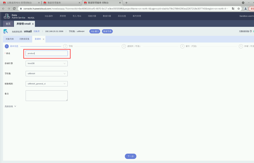 在新建的数据库右侧点击“新建表”,进入数据库“vmall”的表管理页,点击“+新建表”,表名:“product”,其他参数默认,点击“下一步”如下图所示: