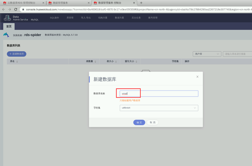点击“登录”进入数据库列表,然后点击“+新建数据库”,数据库名称为“vmall”,点击“确定”,完成数据库创建,如下图所示: