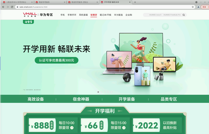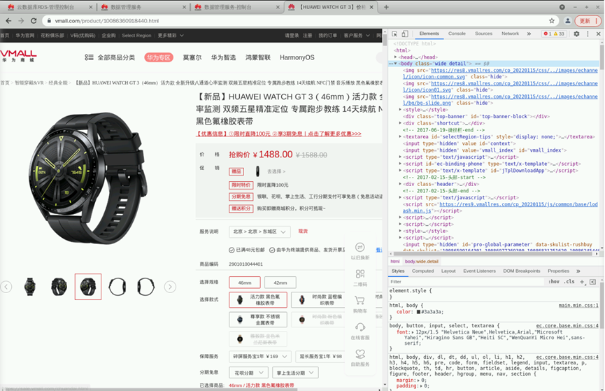 在【实验操作桌面】浏览器新建tab页,输入华为商城地址并访问:https://sale.vmall.com/huaweizone.html,在打开的页面选择一件商品打开商品详情页,如下图所示: