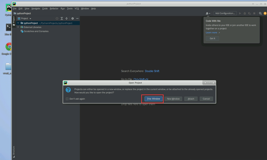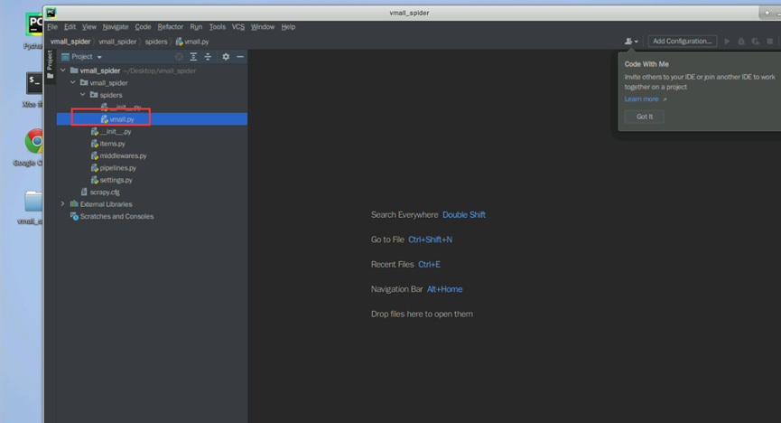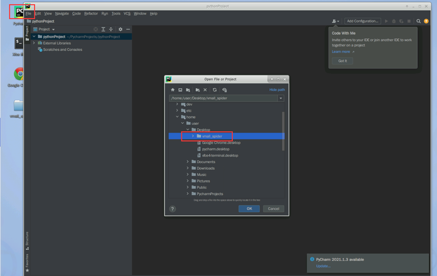 启动“Pycharm”,启动成功点击“File->Open”,选择创建的项目“vmall_spider”如下图所示: