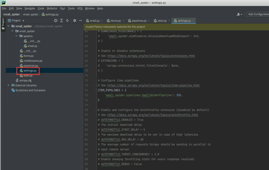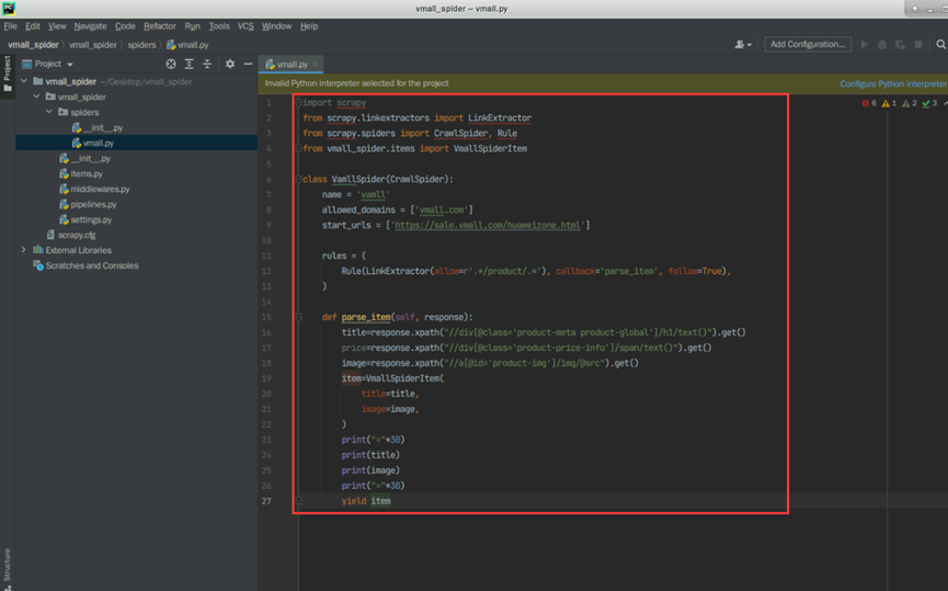 在项目“vmall_spider->“spiders”下,双击打开“vmall.py”文件,删除原有代码,写入以下代码: