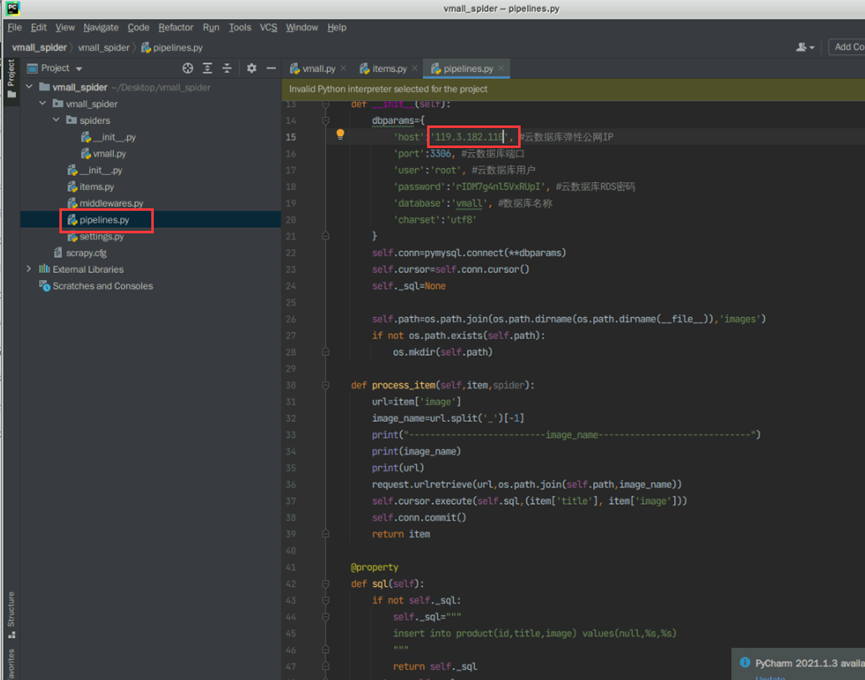 双击打开“pipelines.py”文件,删除原有代码,写入以下代码(使用前面步骤创建的云数据库RDS的密码、前面步骤绑定的弹性公网IP替换代码中的相关信息)。