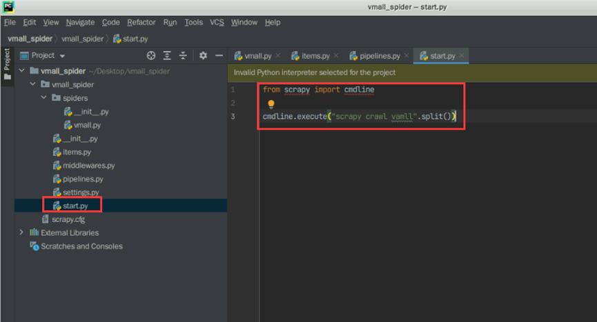 鼠标右键“vmall_spider”(目录第二层)点击“new->Python File”创建“start.py”文件,填入名称“start”,点击“OK”如下图所示: