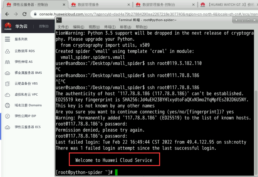 【摘要】 了解华为云产品页面信息,实操体验华为云VPC/ECS/RDS等云服务配置操作,通过使用所购买的华为云产品和终端命令行完成部署Python爬虫。