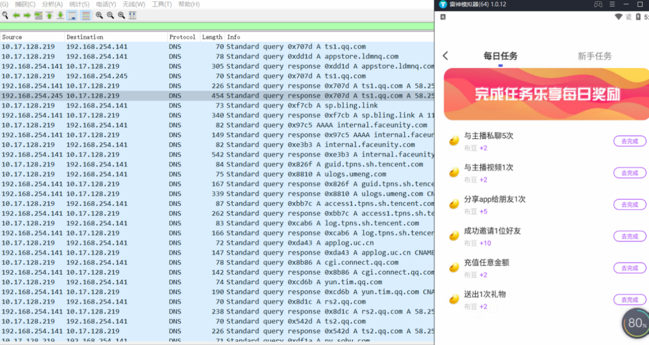SDK启动的时候会HOOK掉APP的所有网络通讯,由于SDK和节点之间是加密传输的,因此抓包也无法获取dns解析记录以及http、tcp等明文信息,全部都是私有加密协议进行了封包。下图为原版dns解析