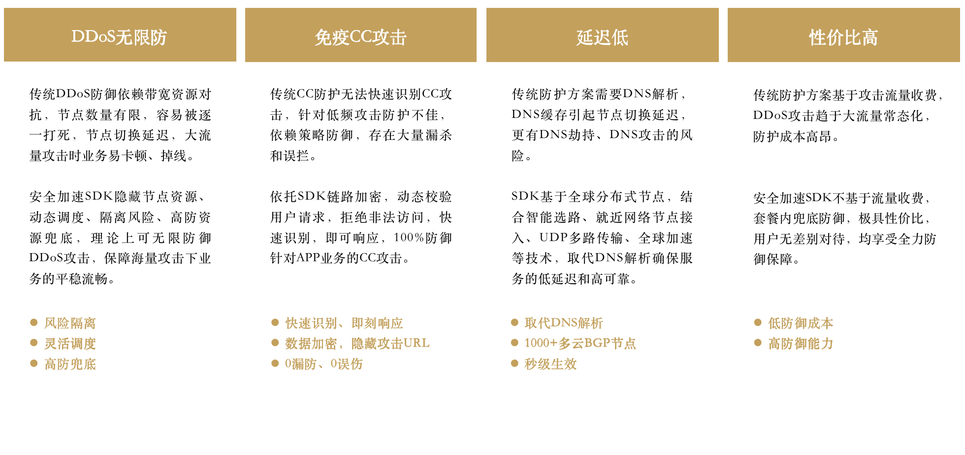 SDK方案优点主要是不依靠生抗来防护,而是通过大量分布式节点调度防护。