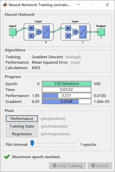 net.trainparam.epochs=500;%最大循环500次;'traingd'不设置默认为梯度下降