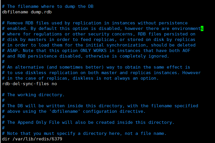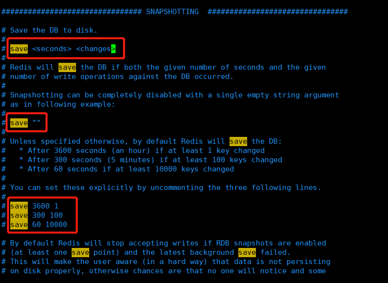 通过进入redis配置文件。执行指令是 vim etc/redis/6379.conf中找到save <seconds> <changes>配置项进行放开,seconds表示多长时间,changes表示多少次数,当同时满足<seconds>和 <changes>的时候会自动触发持久化操作,生成rdb文件,rdb文件生成会放入下图配置好的dir中文件名称也是配置好的dbfilename。