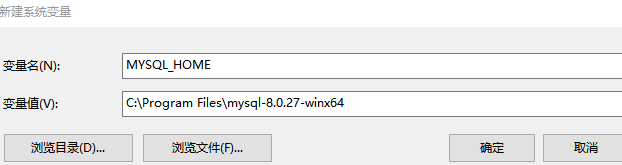 MYSQL_HOME,变量值为C:\Program Files\mysql-8.0.27-winx64,然后点击"确定"