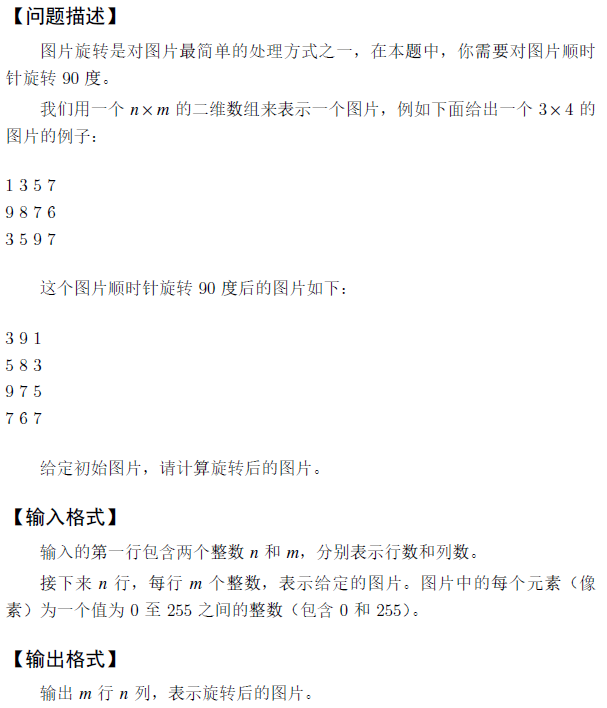 【摘要】 资源限制时间限制:1.0s 内存限制:256.0MB思路:大家可以先看一下俩张图, 我们只需要用一个数组即可,不需要排序旋转之后的数据。旋转之后,行成了列,列成了行,所以输出的时候让原来的列在外循环,原来的行在内循环,数组下标从大到小循环,并且因为数组的下标从0开始,要减1。看代码提交代码import java.util.Scanner;public cl...